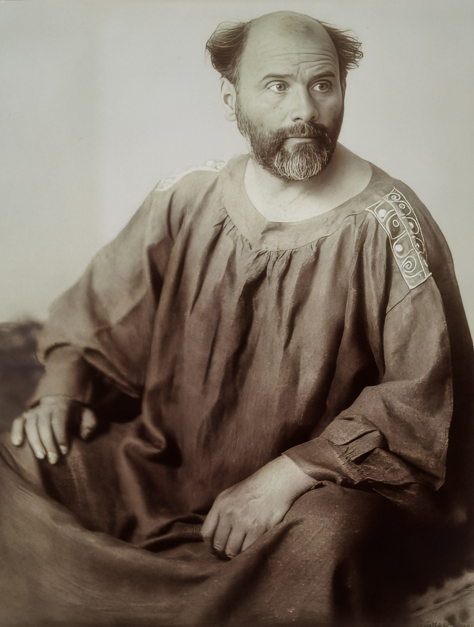 One persistent reading treats him as Klimt’s presence in disguise. Not a literal self-portrait, but an authorial stand‑in: the maker, the one who encloses the world in gold, the one who decides how intimacy appears within the frame. This is ‘Klimt’s position’ more than ‘Klimt’s face.’