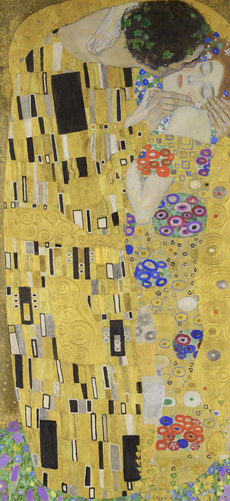 There is also tension in the design. He stands and encloses; she kneels and yields. The union can be read as harmony, but also as the cost of harmony: surrender beneath force. Klimt allows both readings to coexist, which is why the image remains emotionally alive rather than decorative.