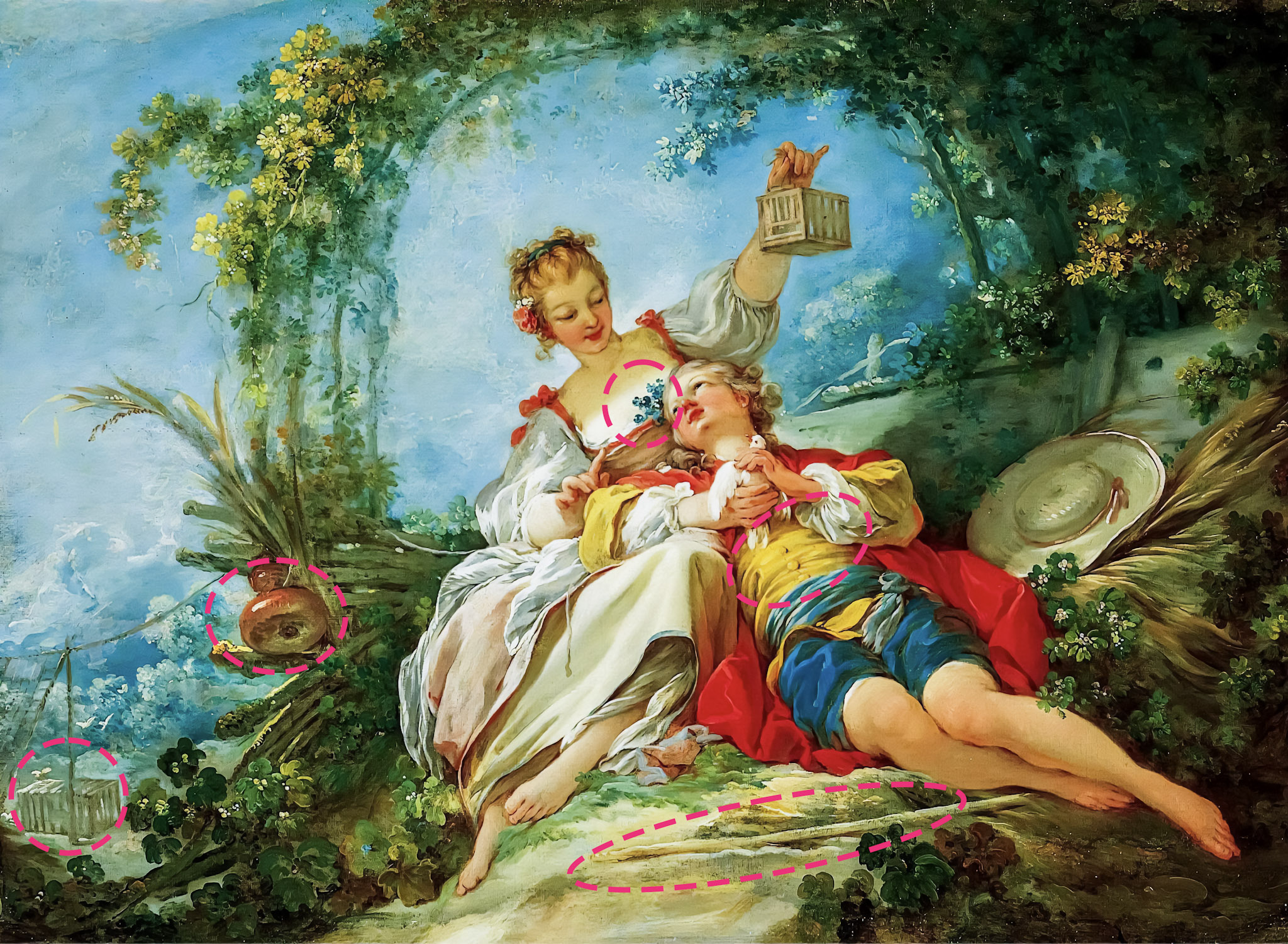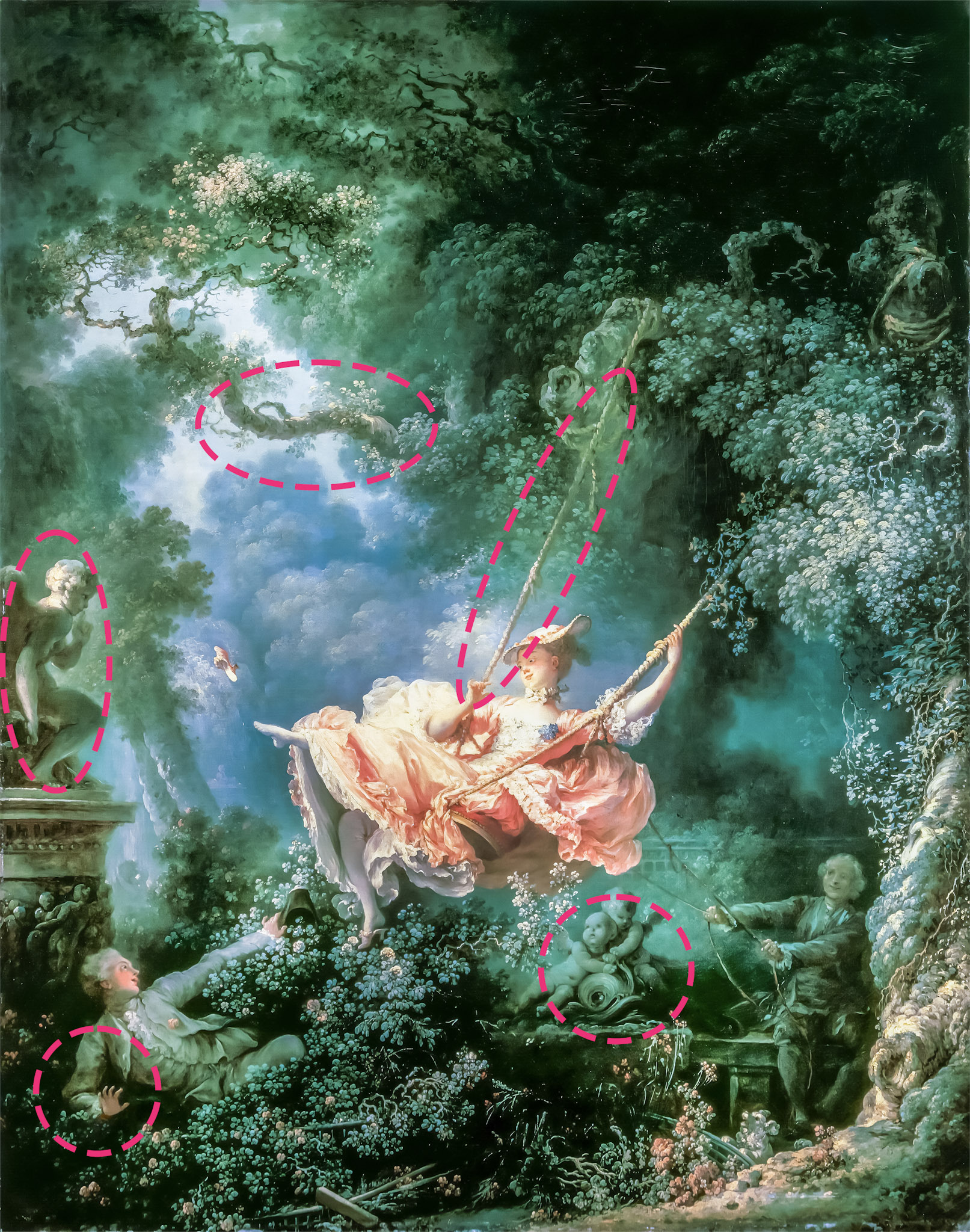 Rococo painting explores intimacy, ornament, and pleasure through graceful figures, decorative interiors, and idyllic outdoor scenes. Lightness of mood and richness of surface define the style, offering imagery filled with gentle movement, flowing fabric, and carefully arranged spaces.