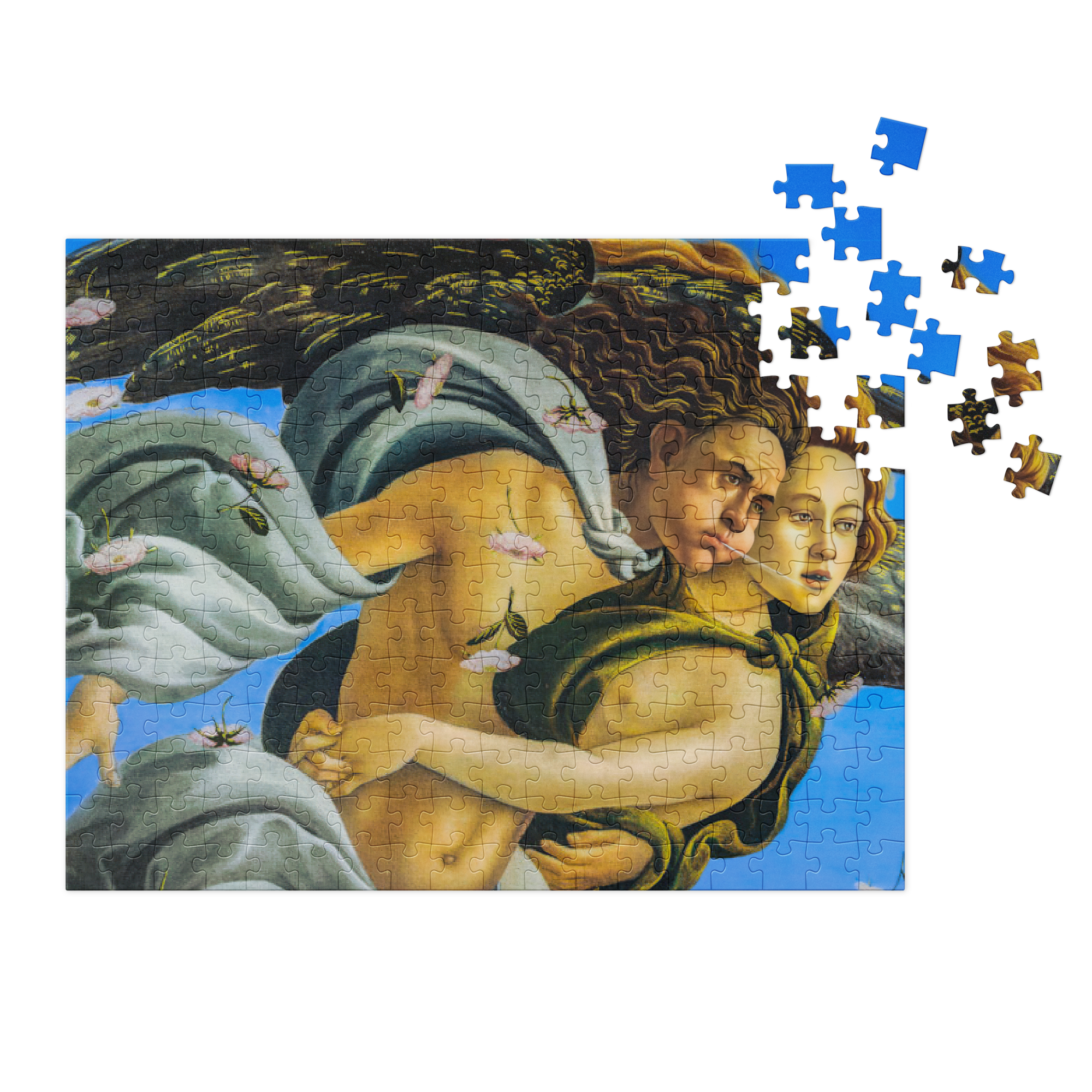 A focused view of the wind gods driving Venus ashore. This jigsaw is based on an optimized crop from The Birth of Venus, preserving motion, contour, and directional force.