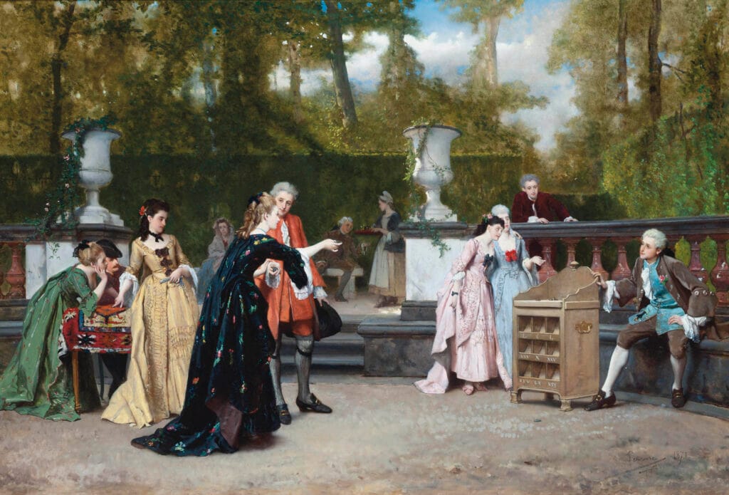 In the late 19th century, European painters looked back to the Rococo period for inspiration. Artists such as Auguste Serrure, Jules Girardet, and Vittorio Reggianini reimagined the grace and humor of 18th-century France, reviving powdered wigs, silken gowns, and intimate interiors.